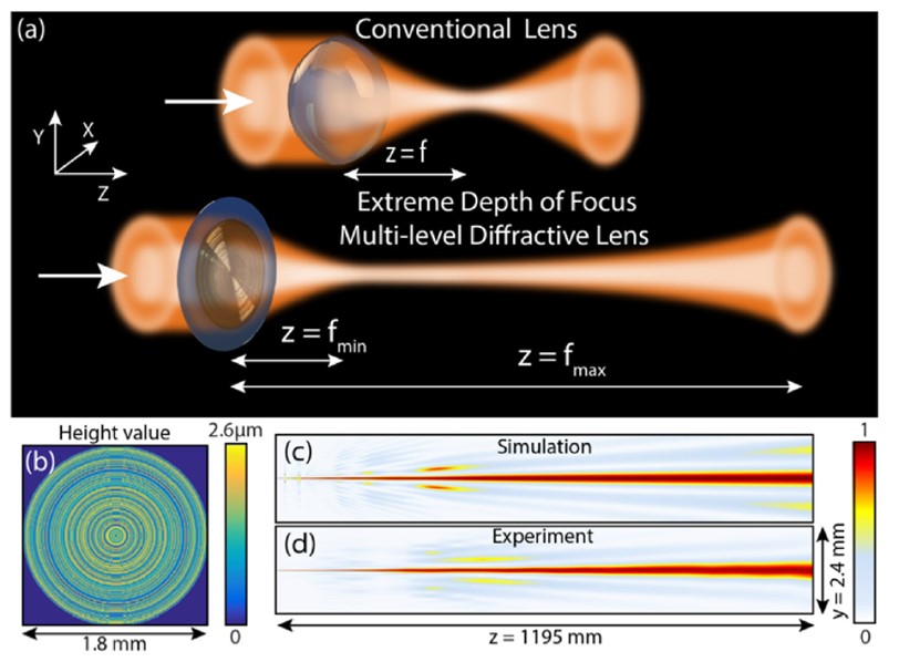 圖 1. (a) 顯示超深焦距(ExDOF)成像的多級(jí)衍射透鏡(MDL)示意圖。(b) MDL 的幾何形狀,焦距范圍為5~1200mm,光圈為1.8mm。(c)焦距為5~1200mm的MDL 在 y-z 平面上的模擬強(qiáng)度分布和(d)測(cè)量強(qiáng)度分布。工作波長(zhǎng)為850 nm。