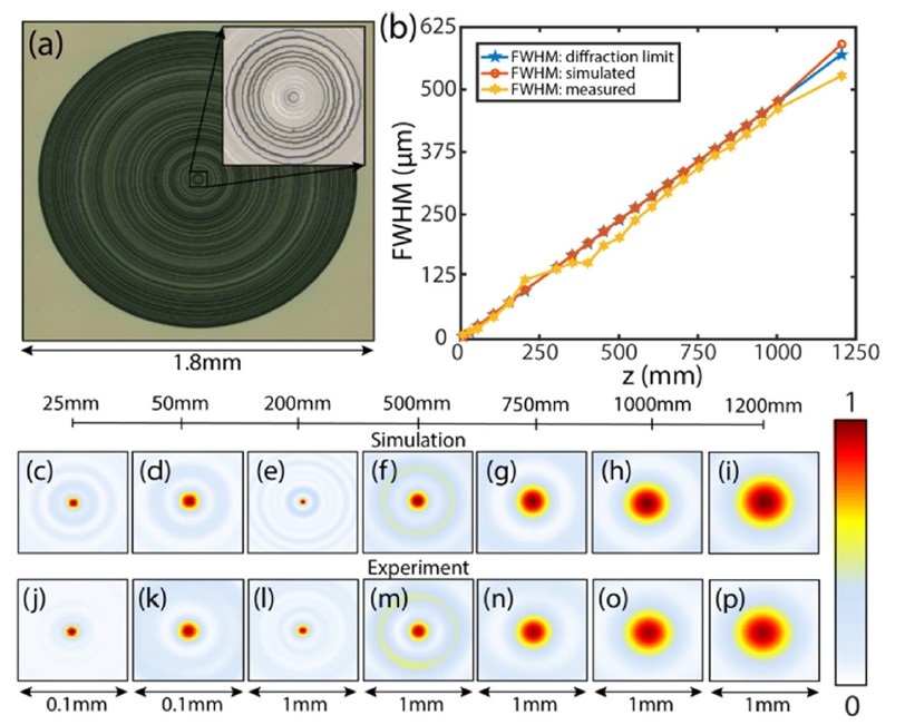 圖 2. (a) 制造的MDL的光學(xué)顯微照片,插圖顯示透鏡中心的放大視圖。 (b) 實(shí)測(cè)、模擬、和衍射極限半峰全寬(FWHM)與z的函數(shù)關(guān)系。(c-i)模擬和(j-p)測(cè)量的點(diǎn)擴(kuò)散函數(shù)(x軸和x軸的光強(qiáng)分布)。(x-y 平面上的光強(qiáng)分布)與z(距離 MDL)的函數(shù)關(guān)系。