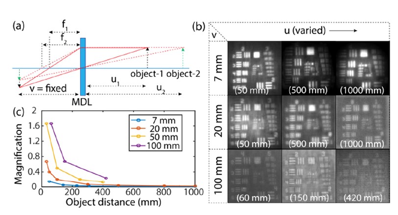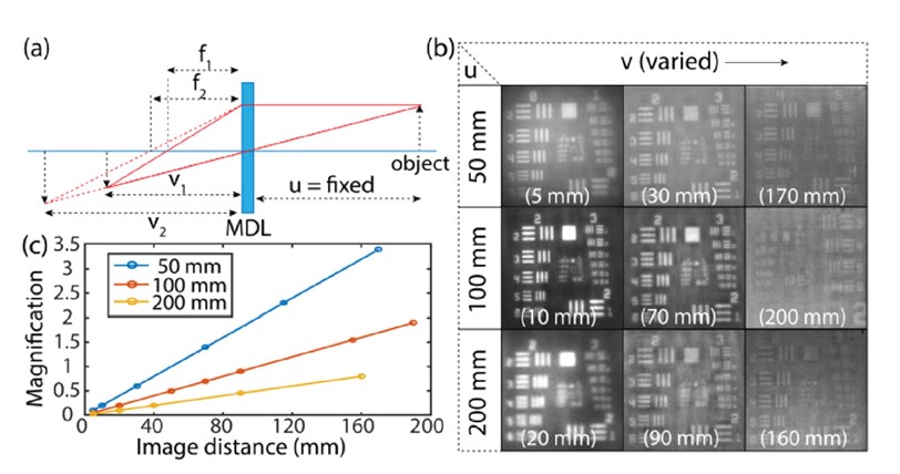 圖3。在不重新聚焦的情況下成像不同的物體距離。(a) 距離MDL不同距離u的物體的聚焦圖像在相同的圖像距離v處形成。(b)固定v和變化u的空軍分辨率圖的圖像。每行v的值是固定的,u的值記在每張圖像的括號(hào)中。(c) 對(duì)于從記錄圖像中提取的各種v值,放大率作為u的函數(shù)。在不重新聚焦的情況下以不同的圖像距離成像。