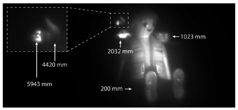 圖5。對(duì)具有大景深的場(chǎng)景進(jìn)行成像。距離在200mm~6米之間的物體是焦點(diǎn)。圖中注明了每個(gè)物體與MDL(u)的距離。類似場(chǎng)景的視頻記錄包括可視化1和可視化2。