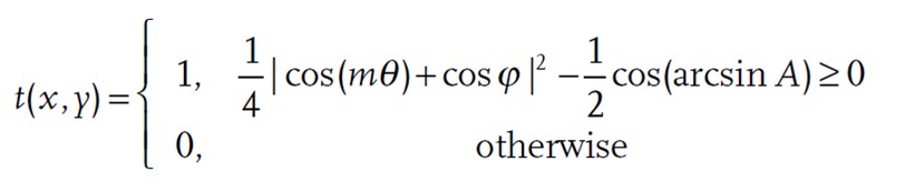 t(x, y) 的值從0到1之間連續變化,這樣的全息圖可以通過將連續值離散為多個級來實驗實現,從而產生多級振幅元素。盡管它能很好地再現所需的球面波,但多層掩模的制造是具有挑戰性的,因為需要精確控制具有不同透射率的多個掩模的灰度。為解決這一難題,我們尋找一種編碼技術來獲得僅二進制振幅的全息圖。我們根據與振幅相關的閾值截斷傳輸函數 t(x, y),然后,我們將小于和大于閾值的t(x,y)的值分別設置為0和1。以這種方式,僅二進制振幅的全息圖可以表示為