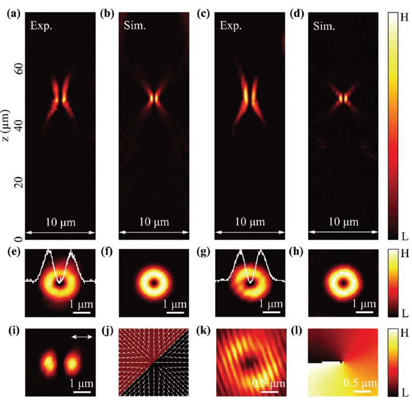 圖 3. 平面透鏡在空間結構光光源下的亞波長聚焦性能。我們考慮了兩種結構光束,即徑向偏振矢量光束和渦流光束。如圖2所示,使用相同的平面透鏡(m=8)對聚焦性能進行了檢驗。(a-d) 在(a,b)矢量光束和(c,d)渦流光束情況下,沿 x - z 平面測量和模擬的衍射光場強度分布。(e,g)為實驗結果;(f,h)為模擬結果。為了研究焦平面的光狀態,(i) 和 (k) 分別顯示了實驗矢量場的 x 分量和渦旋場的平面波干涉條紋;(j) 和 (l) 則分別顯示了矢量光束和渦旋光束在焦平面的偏振和相位分布。